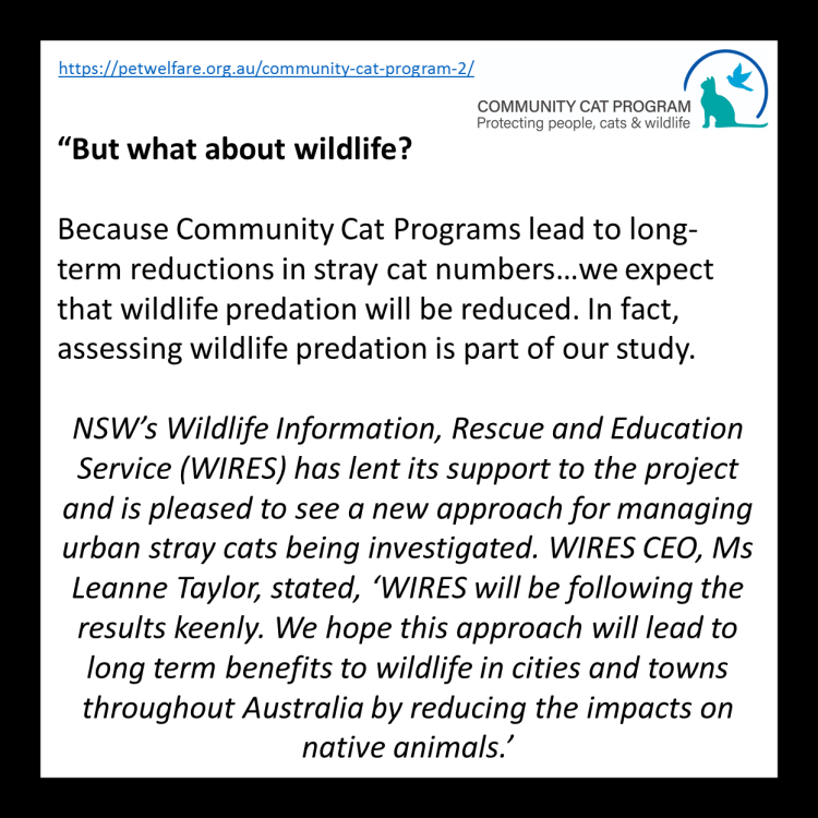 “Most of the animals currently euthanased in Australian shelters and pounds are stray cats from cities and towns. This is because how we currently manage them doesn’t reduce their numbers. It just leads to a constant cycle of breeding, impoundment, then euthanasia. More breeding, more impoundment, more euthanasia…”