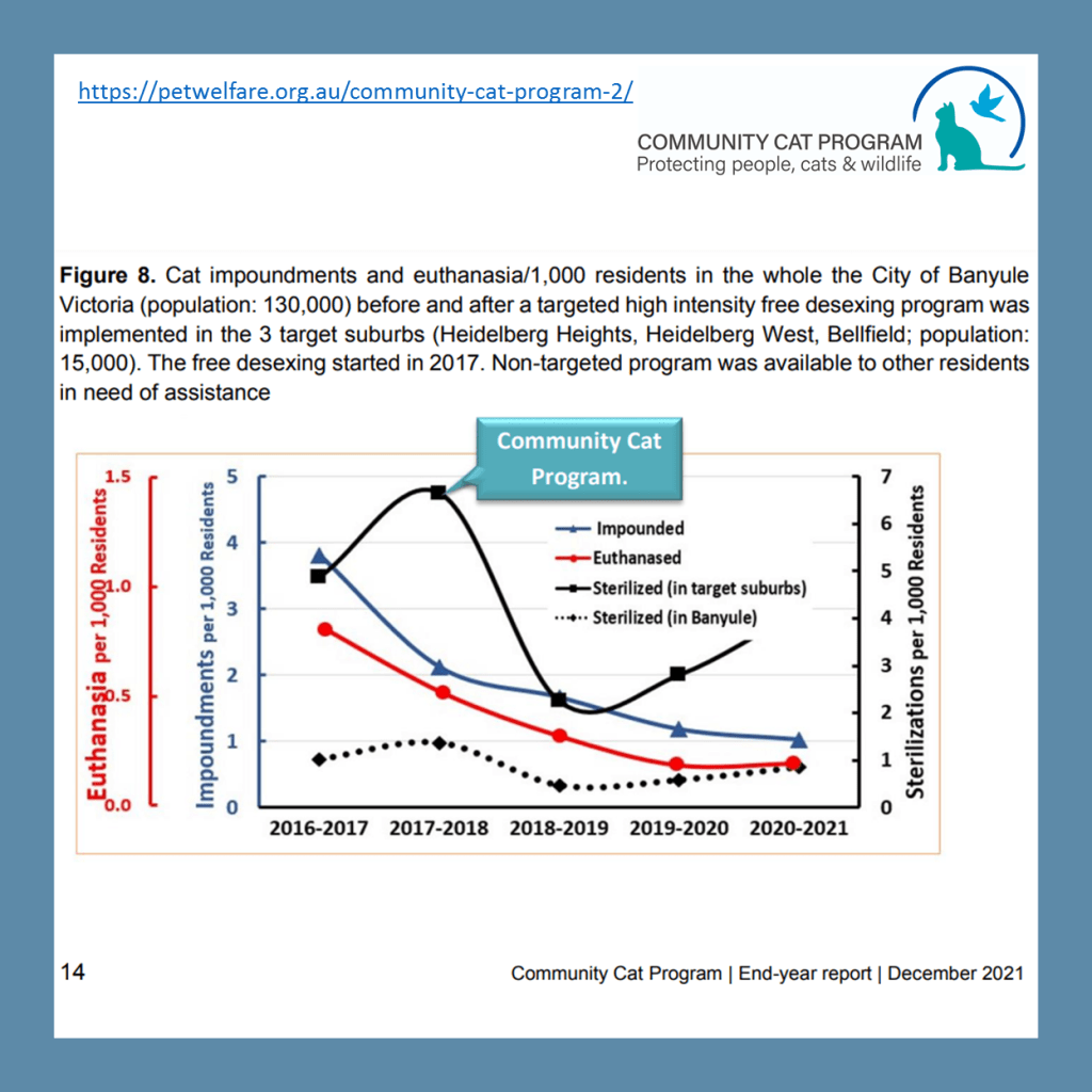 Refer Referenced Sources for the webpage and the 2021 End-year progress report Community Cat Program document.