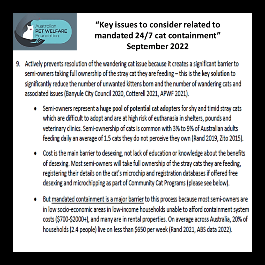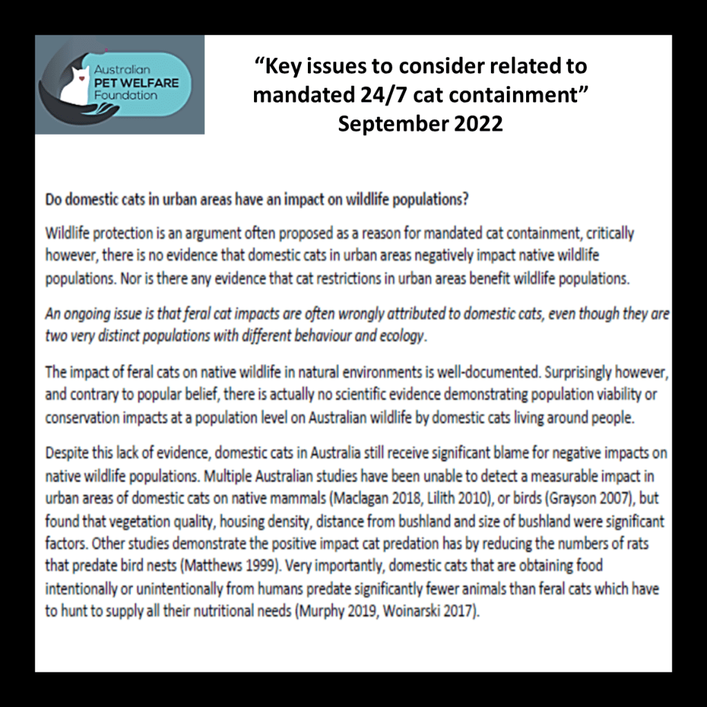 APWF summarises “Based on data from councils, 24/7 cat containment regulations would not provide any measurable benefit in reducing complaints, cat impoundments, potential wildlife predation… and would instead increase costs to local governments.”