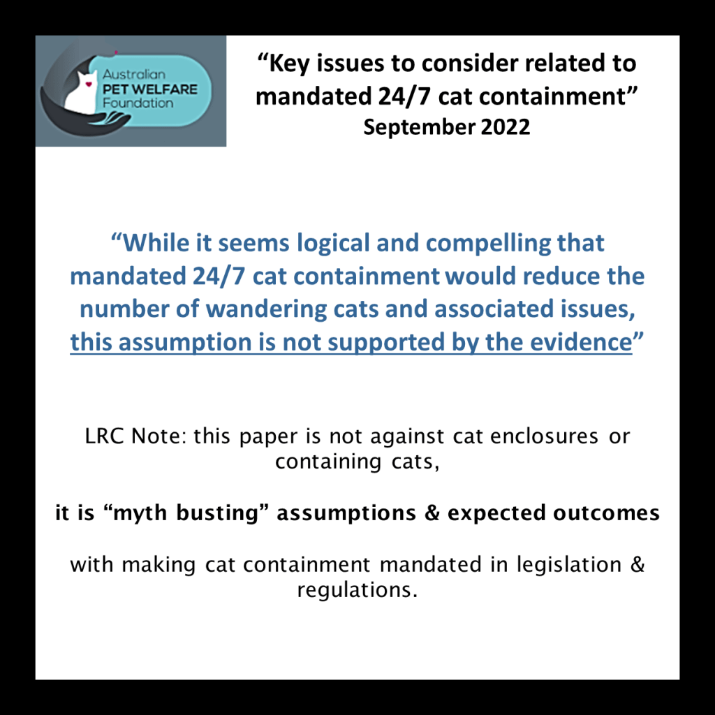 We note that APWF promote, and are not against the use of cat enclosures. [LRC promotes cat enclosures and containment too.]