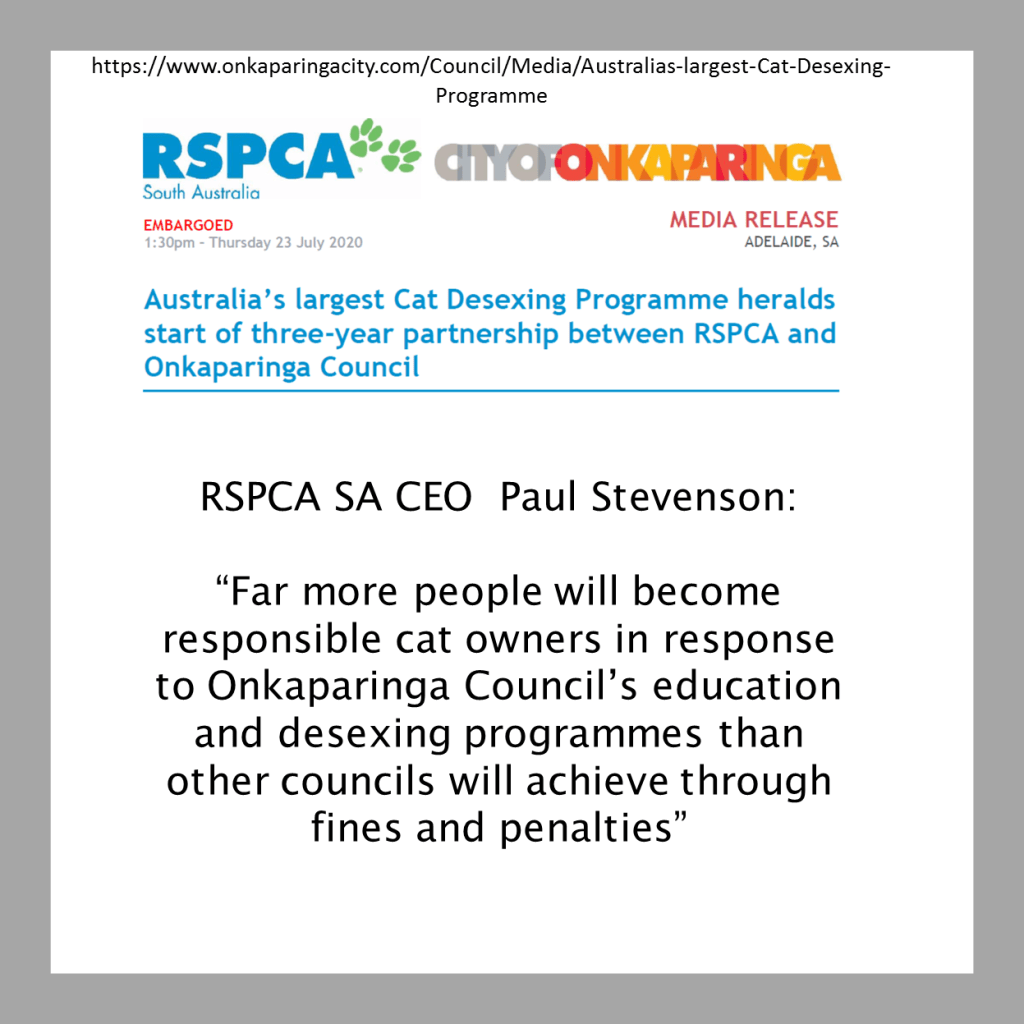 - RSPCA Australia in 2018 noted: “Overall, councils with cat containment regulations have not been able to demonstrate any measurable reduction in cat complaints or cats wandering at large following the introduction of the regulations”.
