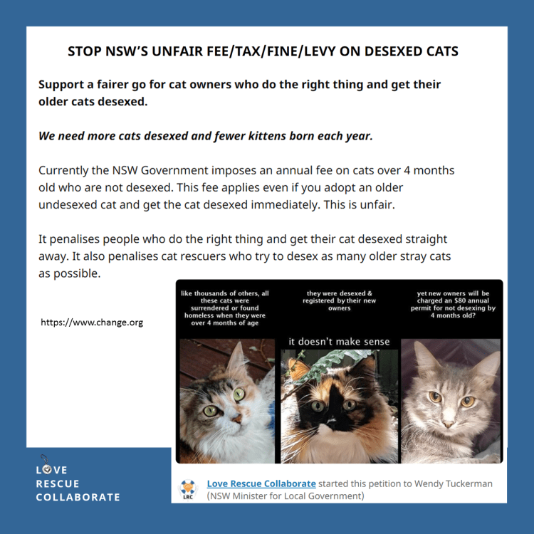 - It really hits hard the small cat rescue groups who are saving many forsaken cats from the streets or surrendered from owners – the government is raising revenue from hundreds of such cats every year, cats who do not go through the council pound systems and do not cost the NSW government nor councils any funds to desex, register and rehome.