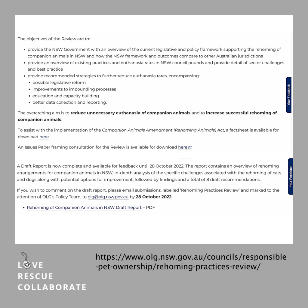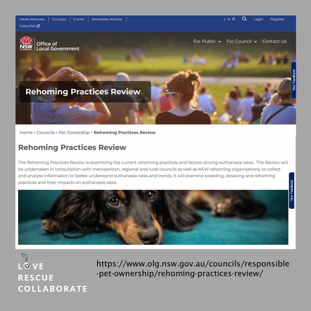 In July 2022 (or perhaps earlier) the NSW state government commenced a review of its practices across councils for rehoming and euthanasia practices for companion animals. This has been a “closed” review for councils, designated rehoming organisations and selected organisations.