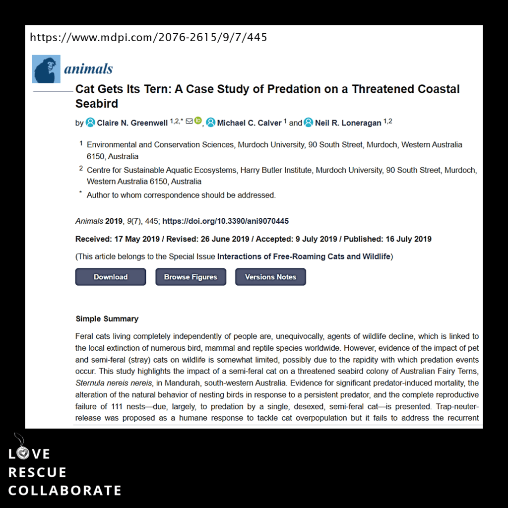 This is a brief set of comments and questions in relation to the Mandurah study presented in 2019 related to two Australian Fairy Tern nesting sites. There are questions on a study which is often cited for anti TNR justification and the Invasive Species social media posts on cats.