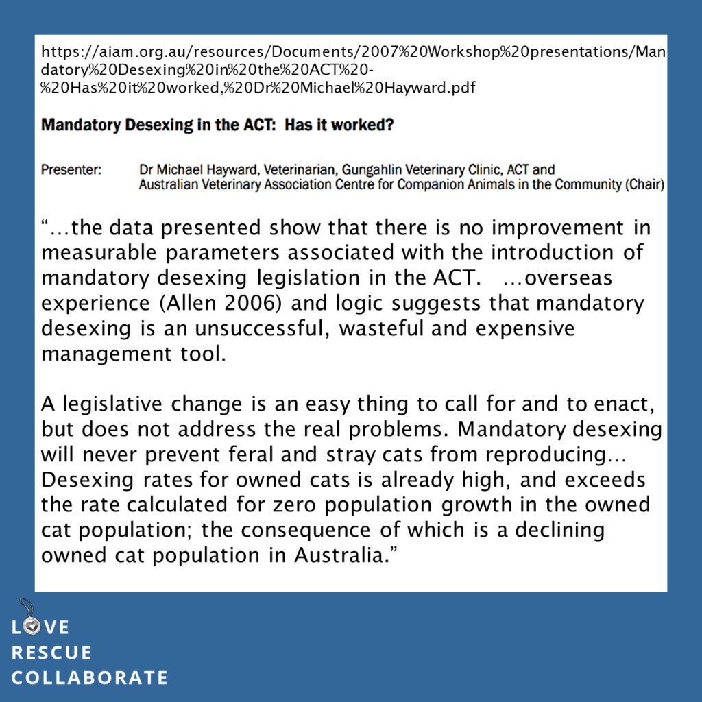 Many animal welfare organisations support that implemented mandatory desexing legislation has not proven worthwhile.