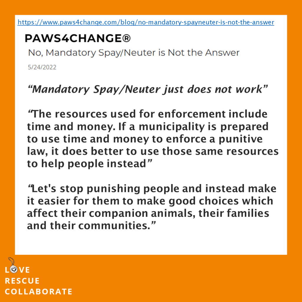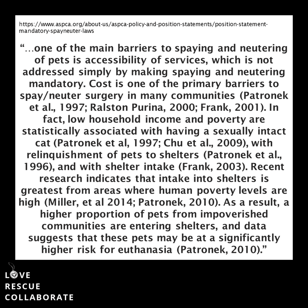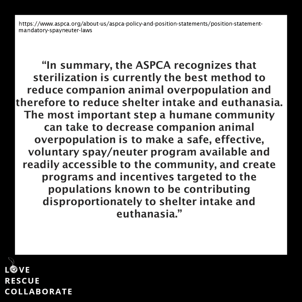 “The most important step a humane community can take to decrease companion animal overpopulation is to make a safe, effective, voluntary spay/neuter program available and readily accessible to the community, and create programs and incentives targeted to the populations known to be contributing disproportionately to shelter intake and euthanasia.” ASPCA