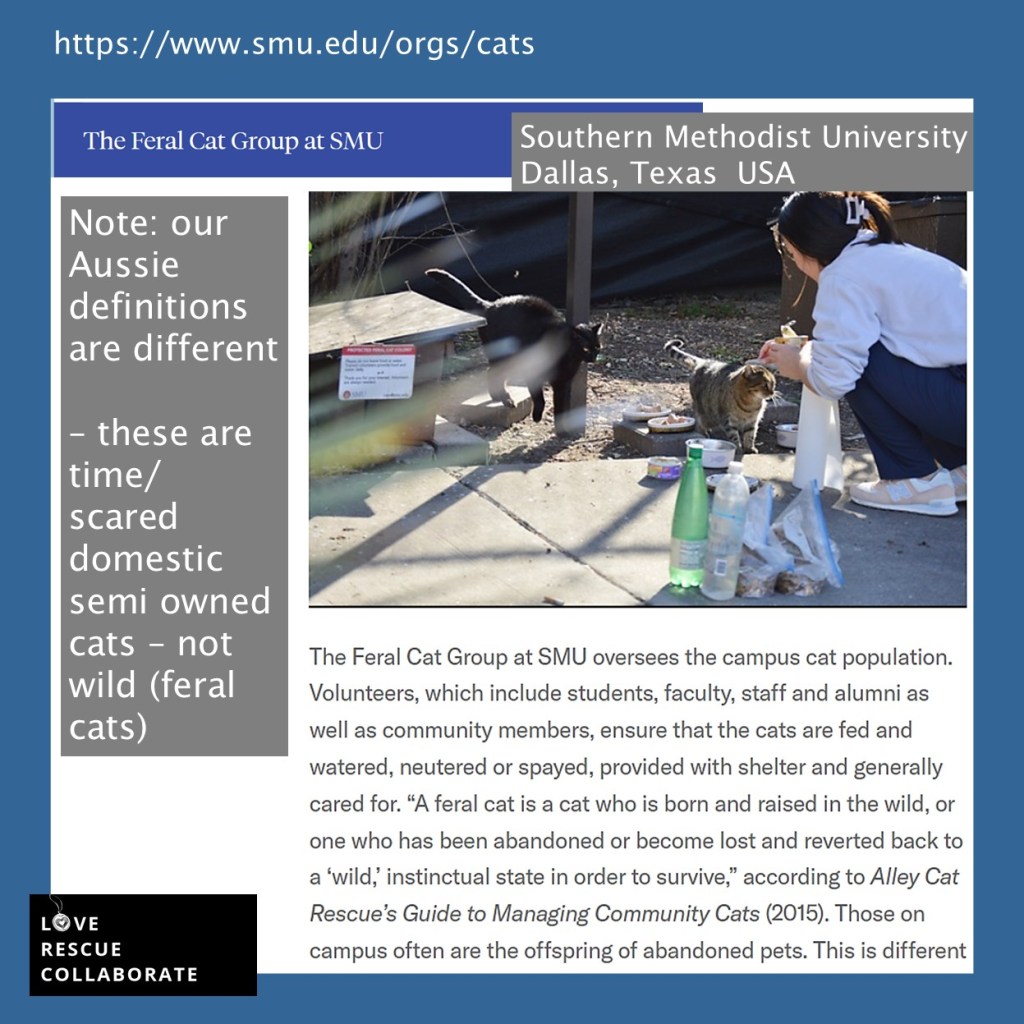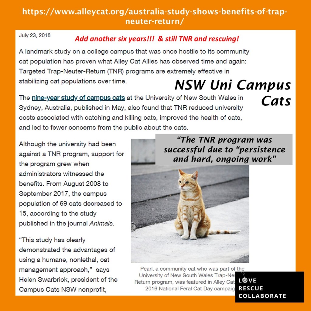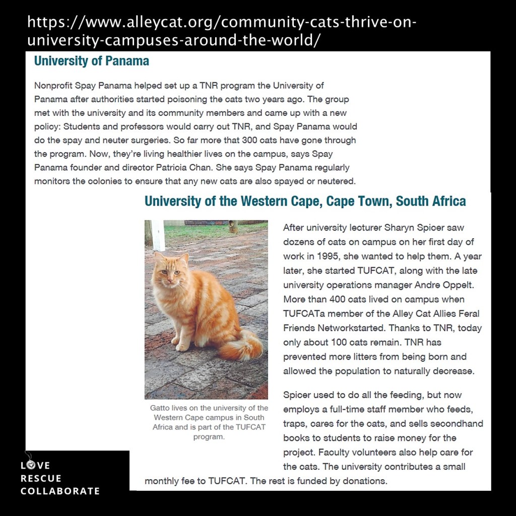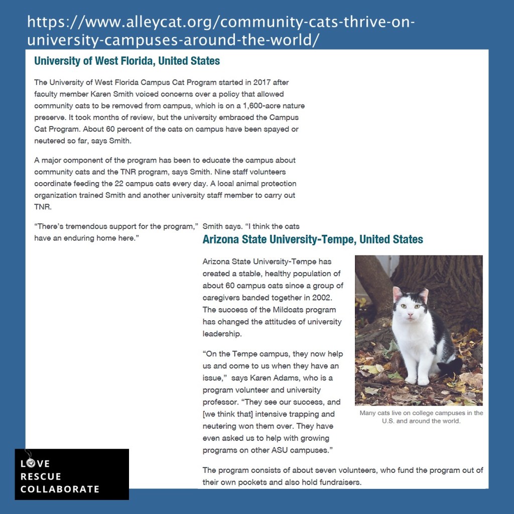 LRC are building up references to examples of cat colonies being maintained on university campuses – from NSW Australia running a program for well over 10 years, through USA and other countries. This “model” works well on private campus grounds where cats may roam, an understanding private organisation, and with kind young volunteers helping out.
