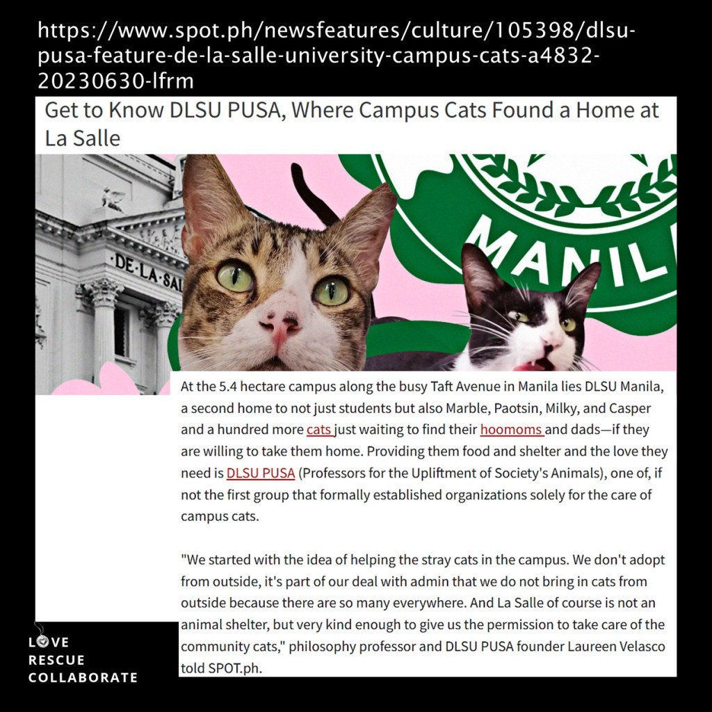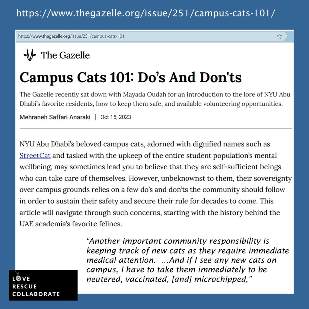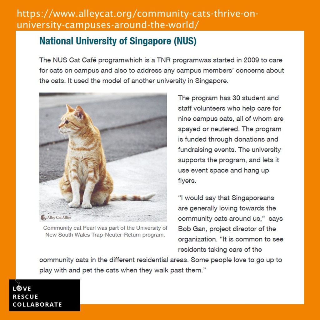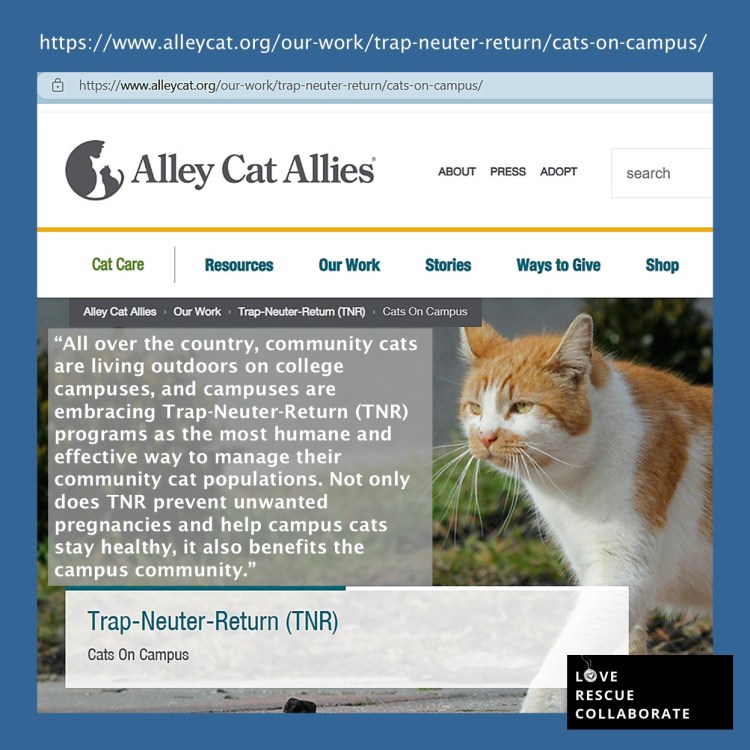 LRC are building up references to examples of cat colonies being maintained on university campuses – from NSW Australia running a program for well over 10 years, through USA and other countries. This “model” works well on private campus grounds where cats may roam, an understanding private organisation, and with kind young volunteers helping out.