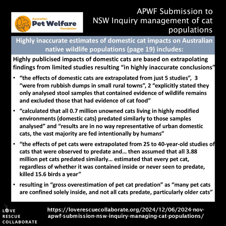 There is trusted analysis by the Australian Pet Welfare Foundation (APWF) of the current weaknesses in the research which is proliferated on the national impacts of all cats and domestic cats on our precious wildlife.