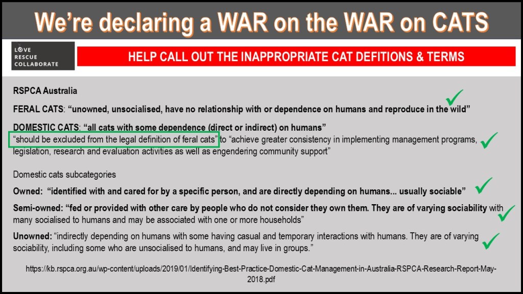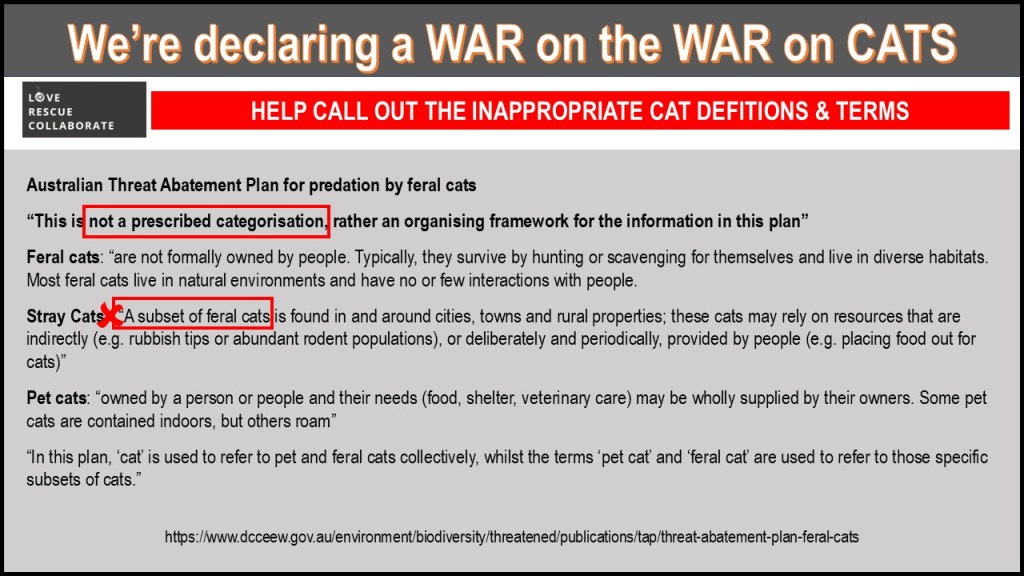 The Aussie Threat Abatement Plan (TAP) for predation by feral cats is inappropriately grouping “stray” cats as a subclass of “feral” cats allegedly for documentation purposes. This blurs the lines between quite distinct categories of cats, and will likely cause much confusion, which likely will influence domestic cats being harmed / destroyed by community members who dislike cats.