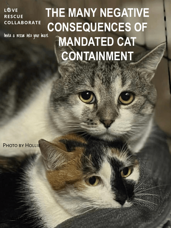 “Mandating containment is not effective in increasing cat containment. It also leads to unrealistic expectations in the community that they will not see a wandering cat, resulting in increased cat related complaints. When implemented, mandated containment increases cat-related complaints, cat impoundments, cat euthanasia, and costs to local governments and shelters”