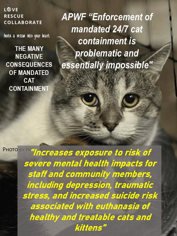 “Enforcement of mandated 24/7 cat containment is problematic and essentially impossible for several reasons…” including “Increases exposure to risk of severe mental health impacts for staff and community members, including depression, traumatic stress, and increased suicide risk associated with euthanasia of healthy and treatable cats and kittens”