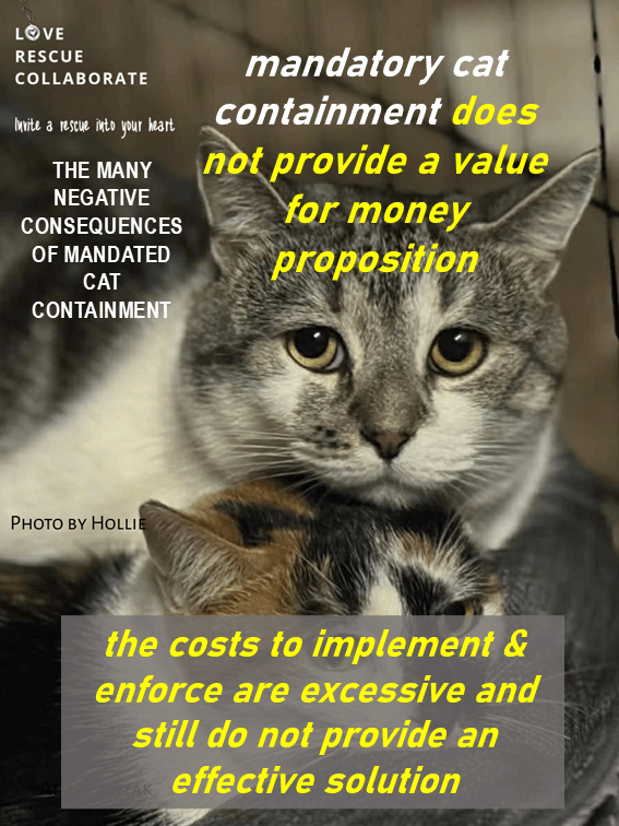 mandatory cat containment does not provide a value for money proposition – the costs to implement and enforce are excessive and still do not provide an effective solution as experienced by a number of Australian councils, can be a disincentive and likely will force people on low incomes to abandon their cats and kittens making the cat crisis worse