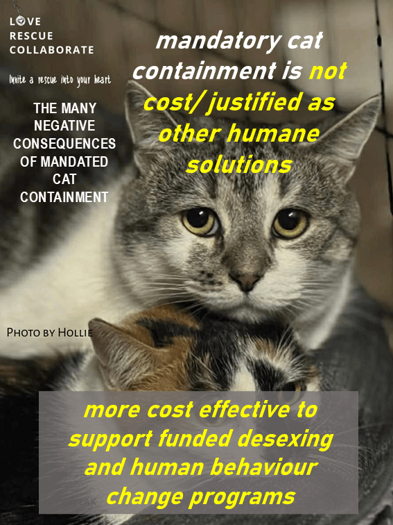mandatory cat containment is not cost/ justified as other humane solutions provide value and benefits for minimising the growing cat populations and impacts on wildlife – it has been proven that it is more cost effective to support funded desexing and human behaviour change programs than a myriad of legislations, policies, processes, management, administration and enforcement teams, refer to the Banyule Council research which showed a four-fold in savings over costs, and achieved payback/ return on investment in around a year or so