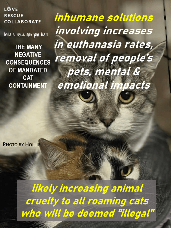 mandatory cat containment systems are viewed as inhumane solutions involving increases in euthanasia rates, removal of people’s pets, mental and emotional impacts to vets and teams, and to rescuers and carers, not aligned with One Welfare approaches and are likely increasing animal cruelty to all roaming cats who will be deemed “illegal”.