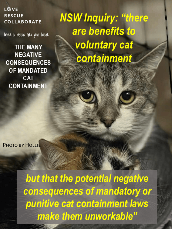 “A major issue that emerged throughout the inquiry was cat containment or cat curfews, and whether or not this should be mandatory. Overall, many believed that there are benefits to voluntary cat containment, but that the potential negative consequences of mandatory or punitive cat containment laws make them unworkable in New South Wales at present. It was apparent to the committee that there is currently insufficient evidence that mandatory cat containment and cat curfew laws are effective, and in fact they could have adverse consequences including the costs imposed on councils and significant increases in euthanasia rates. The committee encourages the Government to fund educational and behaviour-change programs so as to foster the voluntary adoption of cat containment within the community.” https://www.parliament.nsw.gov.au/committees/inquiries/Pages/inquiry-details.aspx?pk=3011