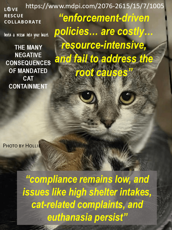 “Animal management officers are central to enforcing these measures, often issuing fines and trapping cats identified as causing a nuisance. Despite these efforts, compliance remains low, and issues like high shelter intakes, cat-related complaints, and euthanasia persist. Moreover, the punitive nature of these policies can place additional financial strain on vulnerable communities and negatively impact the mental health of animal management officers and shelter staff. This approach, focused on penalties, addresses symptoms rather than systemic issues. A shift toward addressing the root causes—through financial support, including support for cat sterilization, resource accessibility, and community engagement—presents a more effective and compassionate solution. Such strategies benefit both the cats and their caregivers while reducing the burden on local governments, promoting sustainable and humane outcomes for communities while better protecting wildlife.” https://www.mdpi.com/2076-2615/15/7/1005