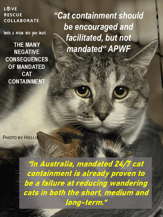 “In Australia, mandated 24/7 cat containment is already proven to be a failure at reducing wandering cats in both the short, medium and long-term. This is supported by the following data…” and APWF provide information from