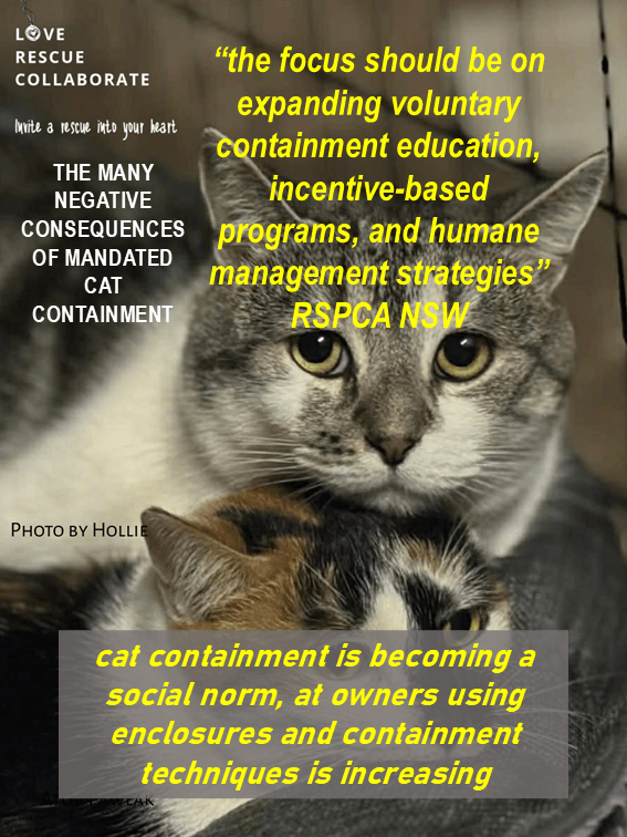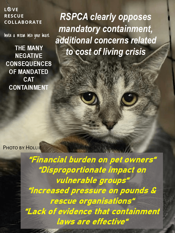 “Mandated cat containment increases cat relinquishment and abandonment due to the added responsibility and potential penalties imposed on owners (RSPCA SA 2021-2022a).”