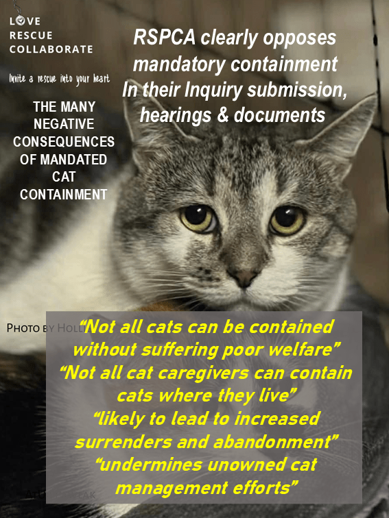 The RSPCA NSW made it very clear they do NOT support mandatory cat containment in their submission, during the hearings and in supplementary documents for the NSW Inquiry.