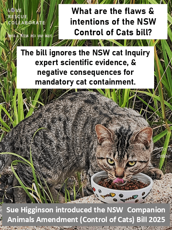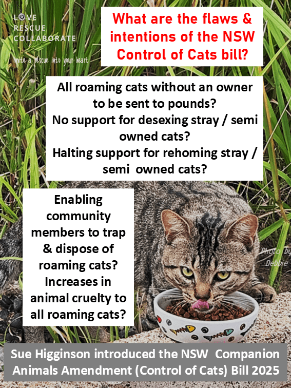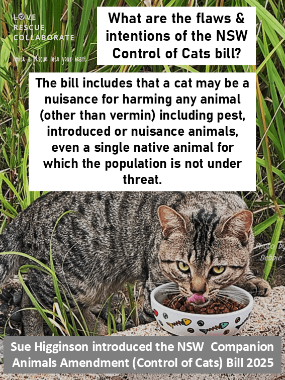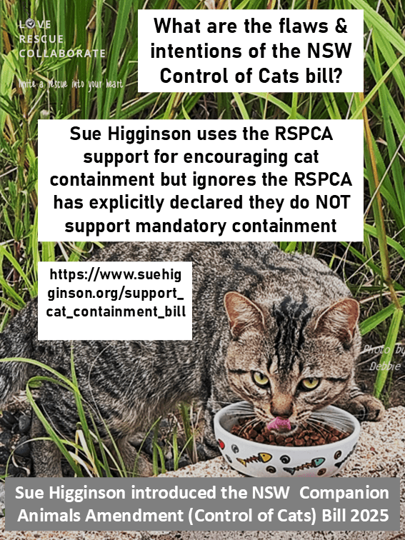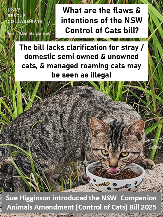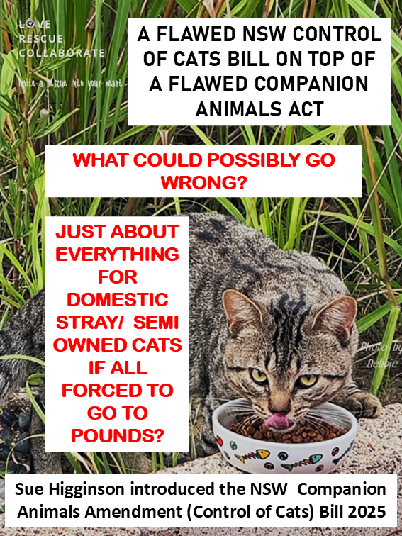 Especially for stray / domestic semi owned and unowned cats for which there is little definition in the current CA Act with a bill introduced by Sue Higgens which is flawed and lacks detail, and a flawed Greens NSW Cat Management Plan that appears to be back in their team for “more work”.