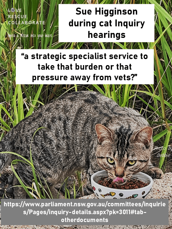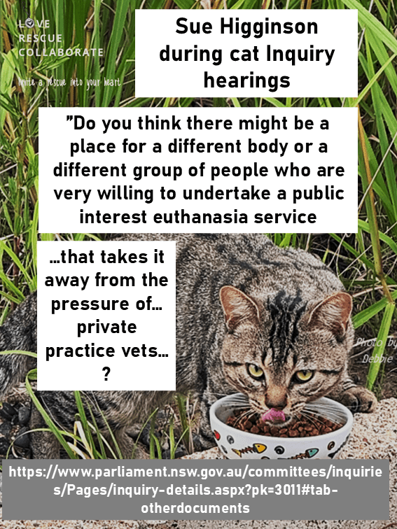From Sue Higginson’s comments during the Inquiry hearings, it appears there is a Greens NSW aim to target all roaming unchipped cats for mass euthanasia, in a manner potentially different to current humane standards by professional vets under our councils.