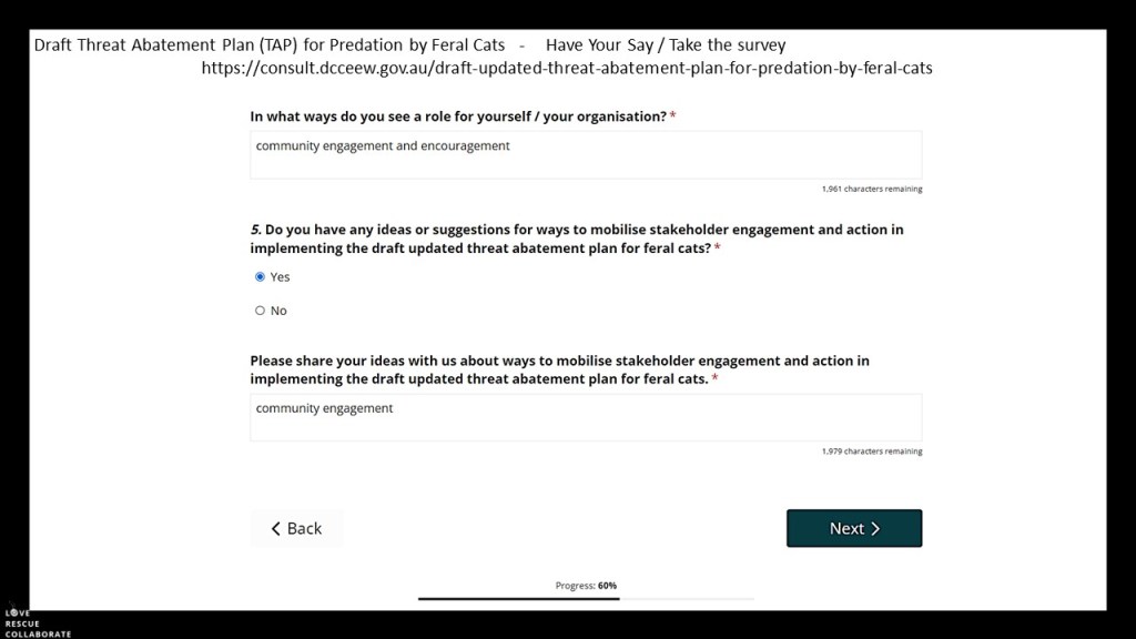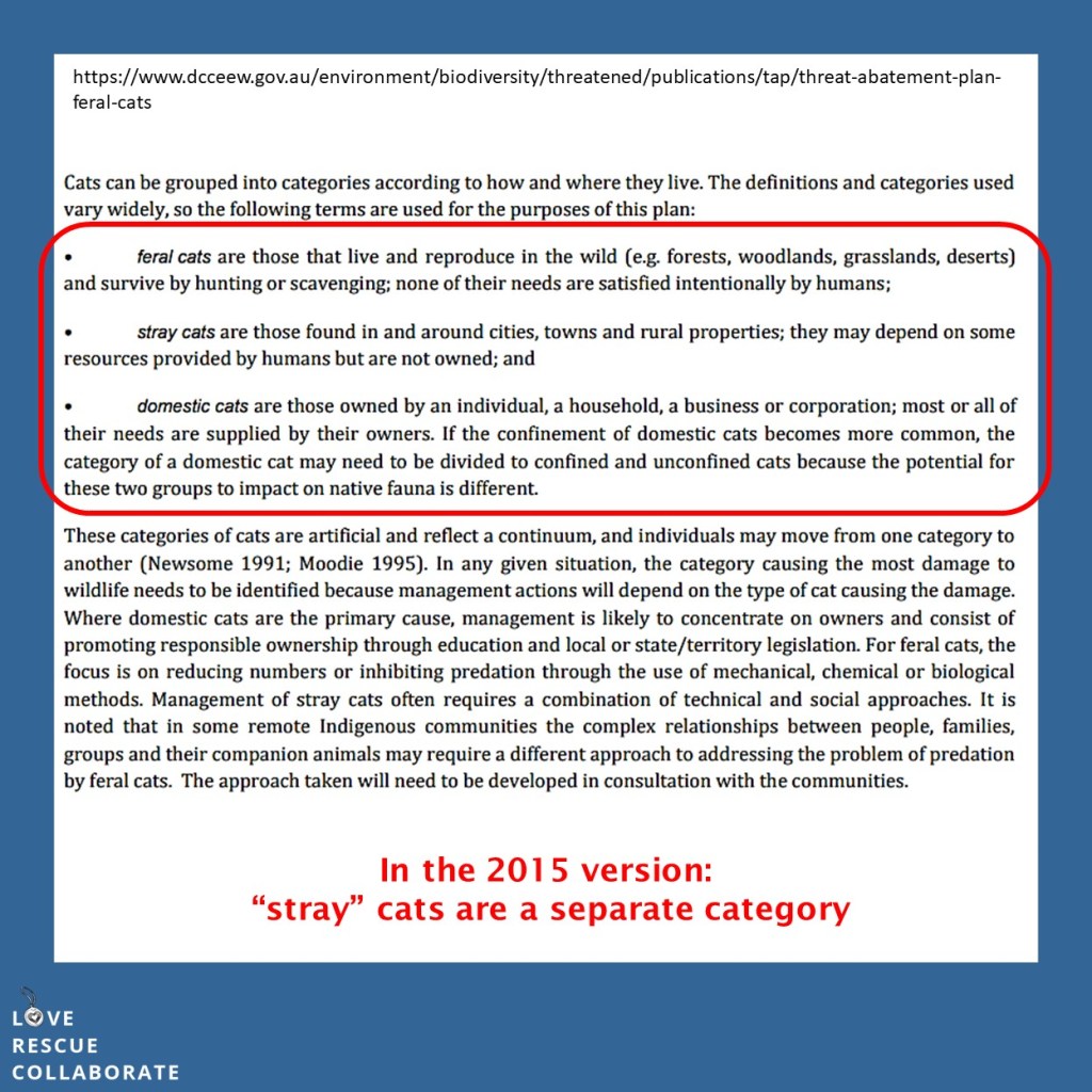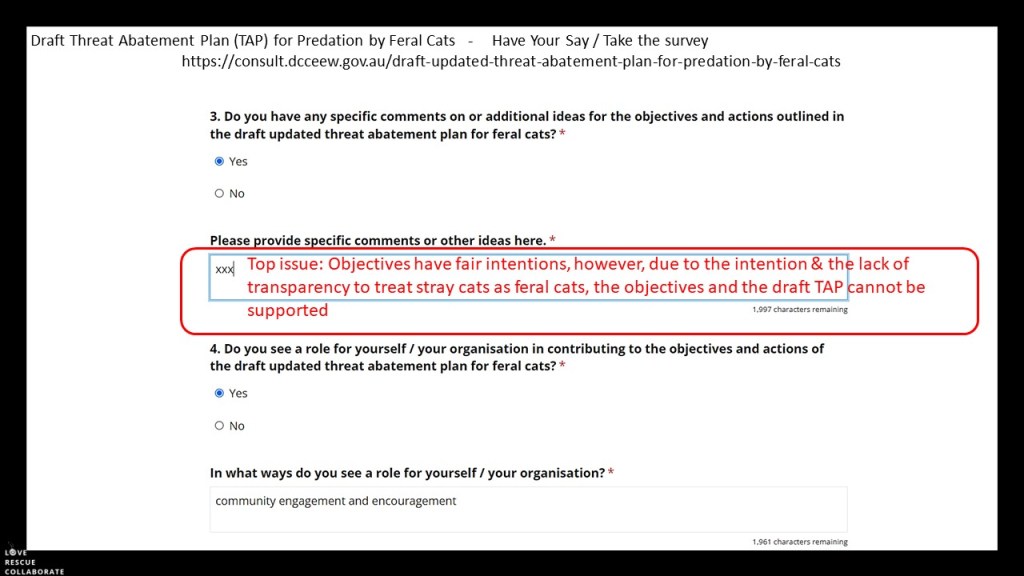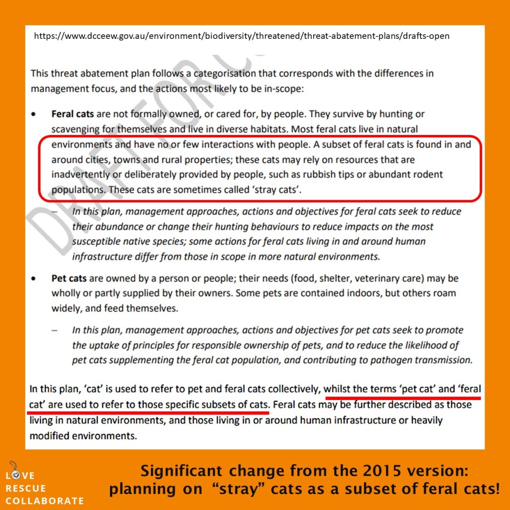 The blurring of the lines between feral cats and domestic cats, mainly in the form of the images used, and the lack of mentioning that the feral cat term in the draft TAP is proposed to be expanded for stray cats who are domestic semi owned and domestic unowned cats, ie that stray cats may also be targets for the Felixer Machine, shooting programs and increased baiting