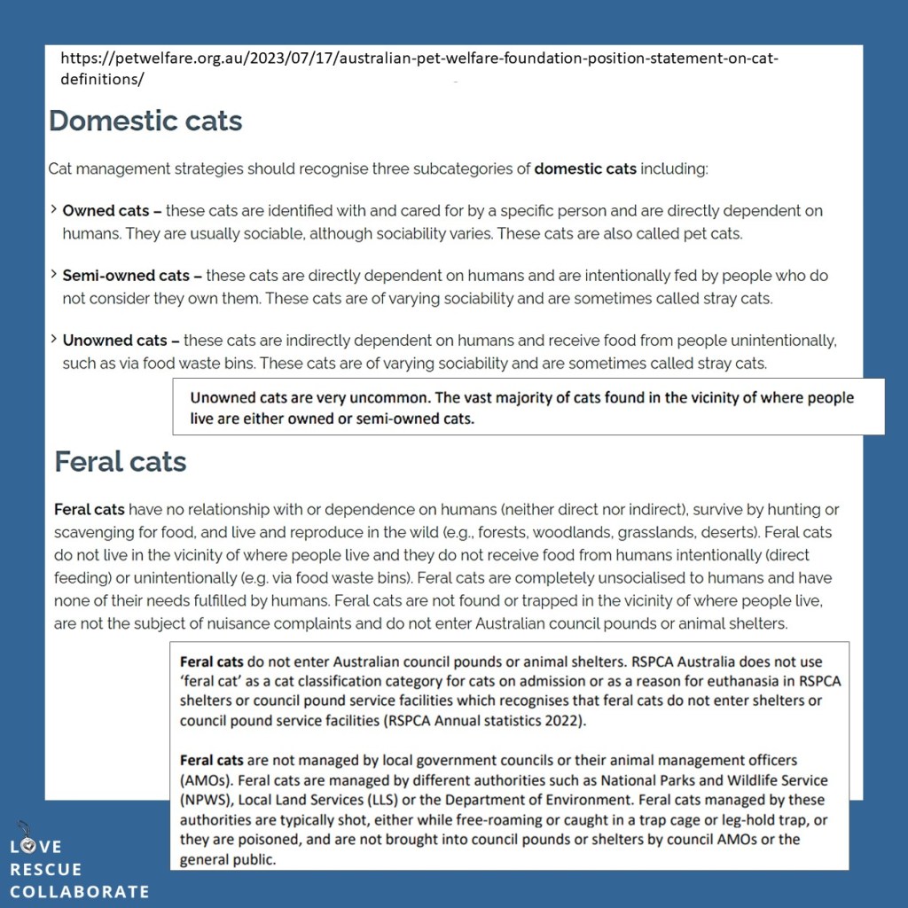 This blog is a summary of the evolution of the terms and definitions for cats in Australia, ie how do we categorise cats largely by their behaviours. These terms (however poorly defined) are critical as they dictate or imply legal obligations – whether you agree with them or not. Our LRC post references: