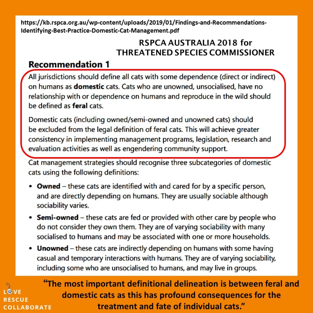 “Changes to state and local government bylaws are urgently required to allow management of owned, semi-owned and unowned cats using scientifically proven, best-practice methodologies.” (page 19)