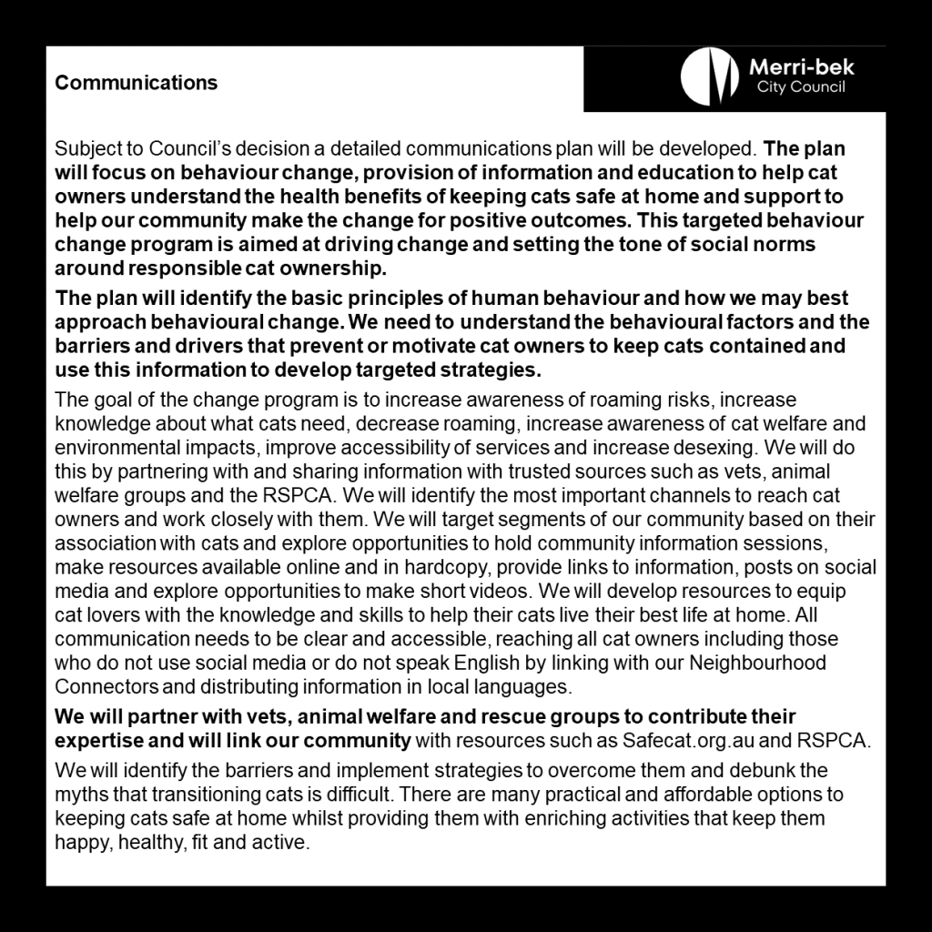 - a desexing initiative to decrease the number of cats breeding and kitten numbers,